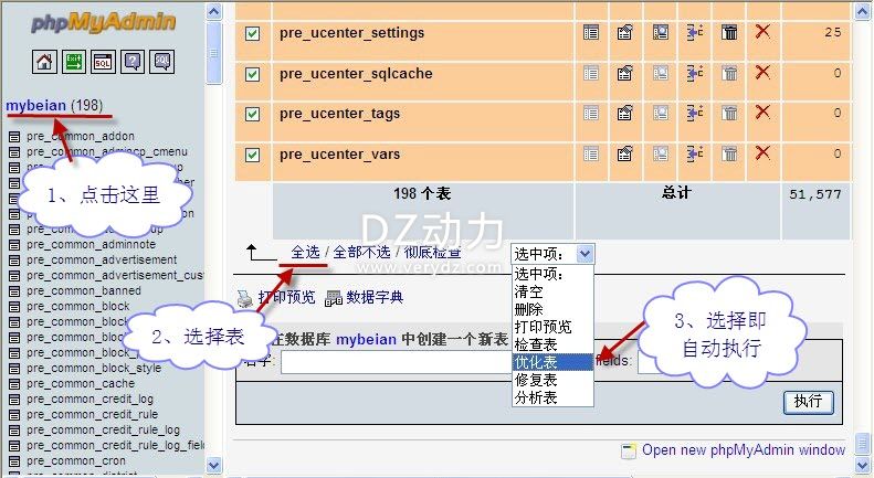 選擇數(shù)據(jù)庫--->選擇要優(yōu)化的表,或者選擇全部表-->選中項(xiàng)-->優(yōu)化表,選中即可自動(dòng)執(zhí)行完成。如圖: