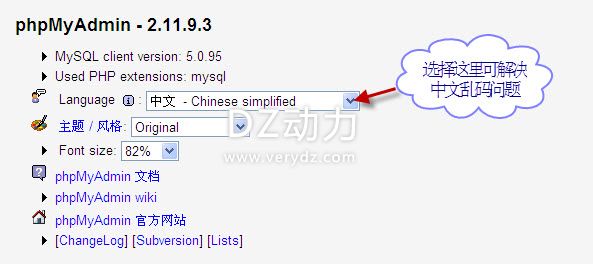 2、進入phpmyadmin后,有時會出現數據庫表內容漢字顯示為亂碼,解決方法:點擊主頁圖標,將Language選擇為簡體中文,如下: