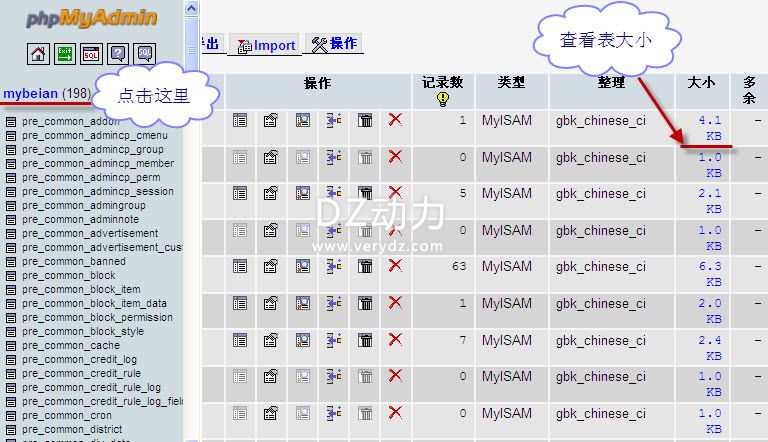 5、針對discuz!軟件用戶,目前版本(discuzX2.5)清空表名末端moderate,log的表不會影響到網站正常使用,另外,短消息表(pre_ucenter_notelist)如果比較大也可以清理,帖子(post)、主題(thread)、會員(member)表不建議整體清空,如通過網站后臺清理垃圾會員及垃圾貼,清空回收站后,最好優化一下數據表再重新通過步驟3查看總數據庫大小。優化方法見: