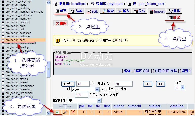 4、清空某個表的所有數據,如帖子表pre_forum_post:
