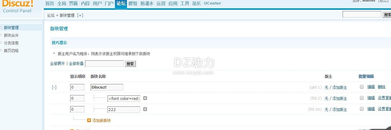 方法一:進入后臺 => 版塊,然后直接修改版塊的名稱,為名字外邊套一個顏色代碼,比如版塊名稱是:111,那么我們將其修改為: