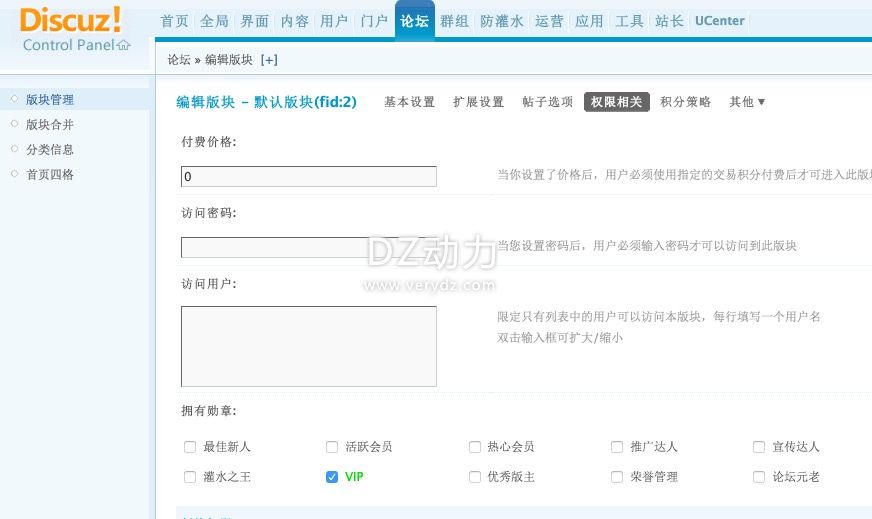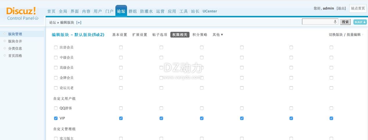 1、進入論壇后臺,點擊論壇,版塊管理,編輯需要設置的版塊,權限相關,只勾選允許訪問的用戶組權限,點提交即可。