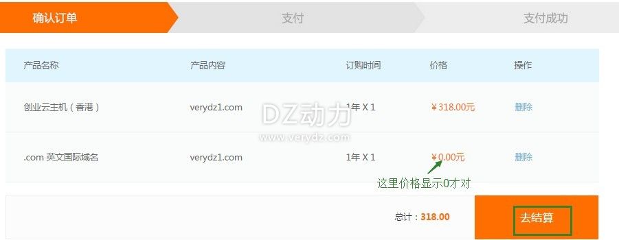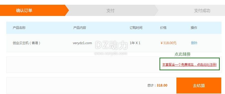 4、確認后進入購物車點擊“本套餐含一個免費域名,點擊此處注冊”