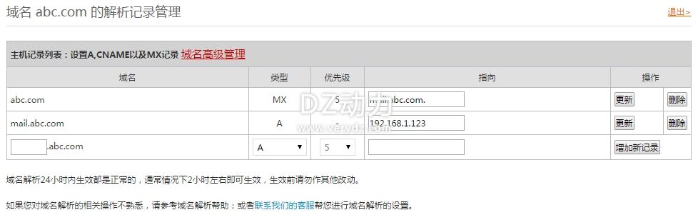 1.做域名的MX郵件交換解析記錄設(shè)置到mail.abc.com.。(abc.com改為您的域名)