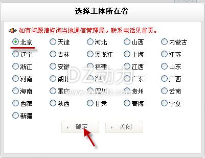 2. 選擇備案號所屬省,如(京ICP備12032630號),選擇“北京”,點確定;